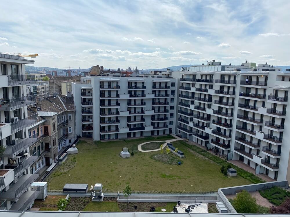 - Az erkélyről panorámás kilátás tárul elénk. A belső udvar parkosított, színvonalas.